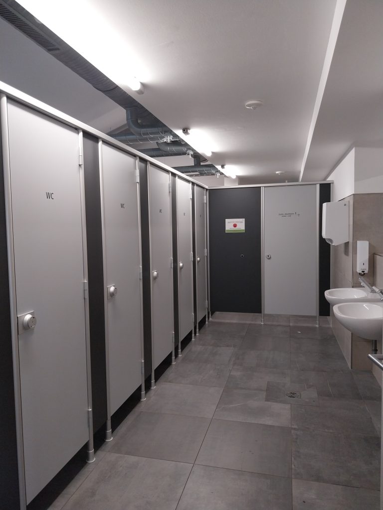 Sie haben einen Gemeinschaftsbereich mit Tischen, Küchen, Toiletten, Toiletten, Toiletten …