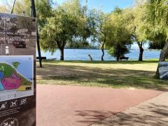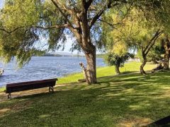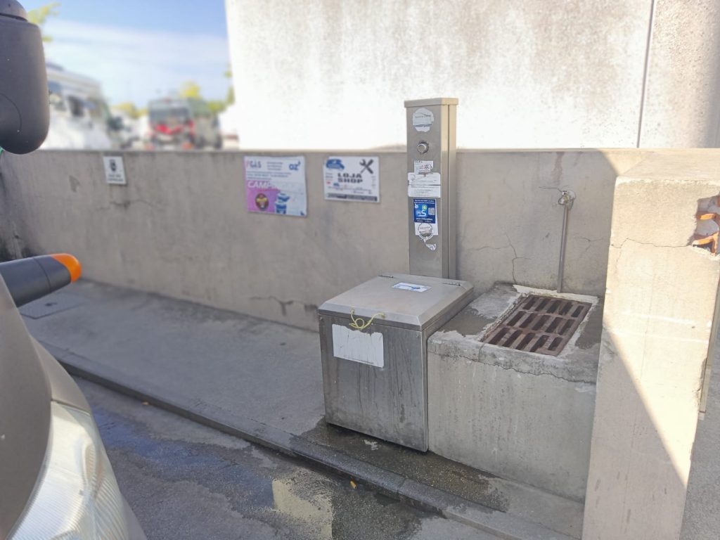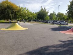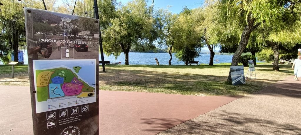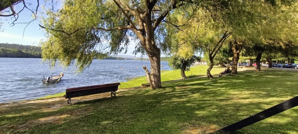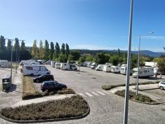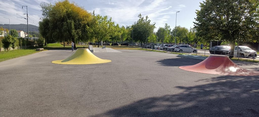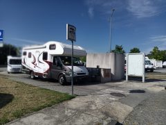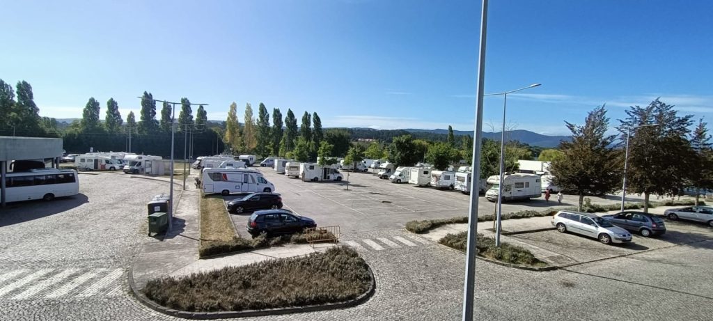 Bonito local, junto ao rio, com algumas arvores e piso em alcatrão com lugares demarcados. Área iluminada. Casa de banho publica, pago. No final do parque existe uma linha de comboio.
