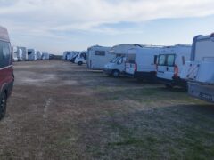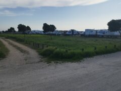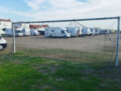 Antigo campo de futebol se transformou em parque de autocaravanas. Piso em terra batida atrás das dunas com acesso ao passadiço e à praia.